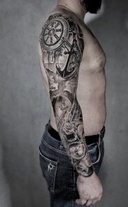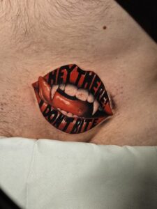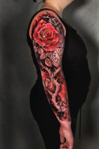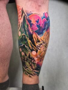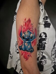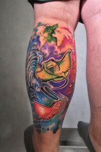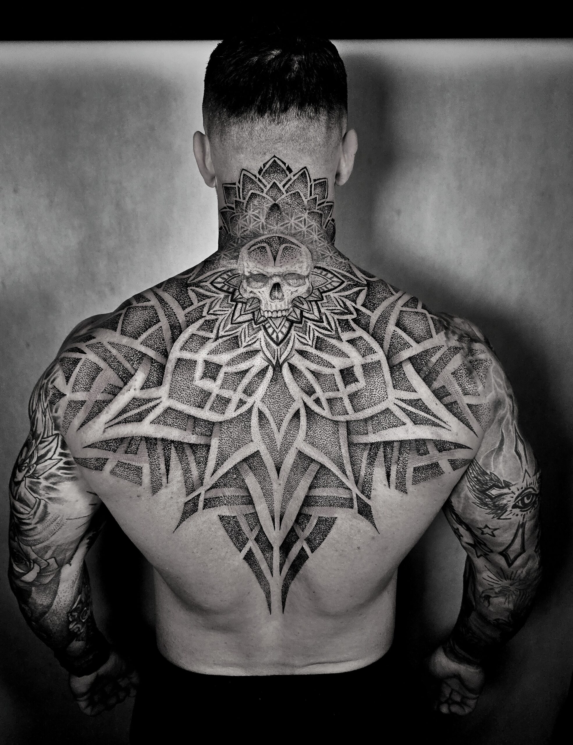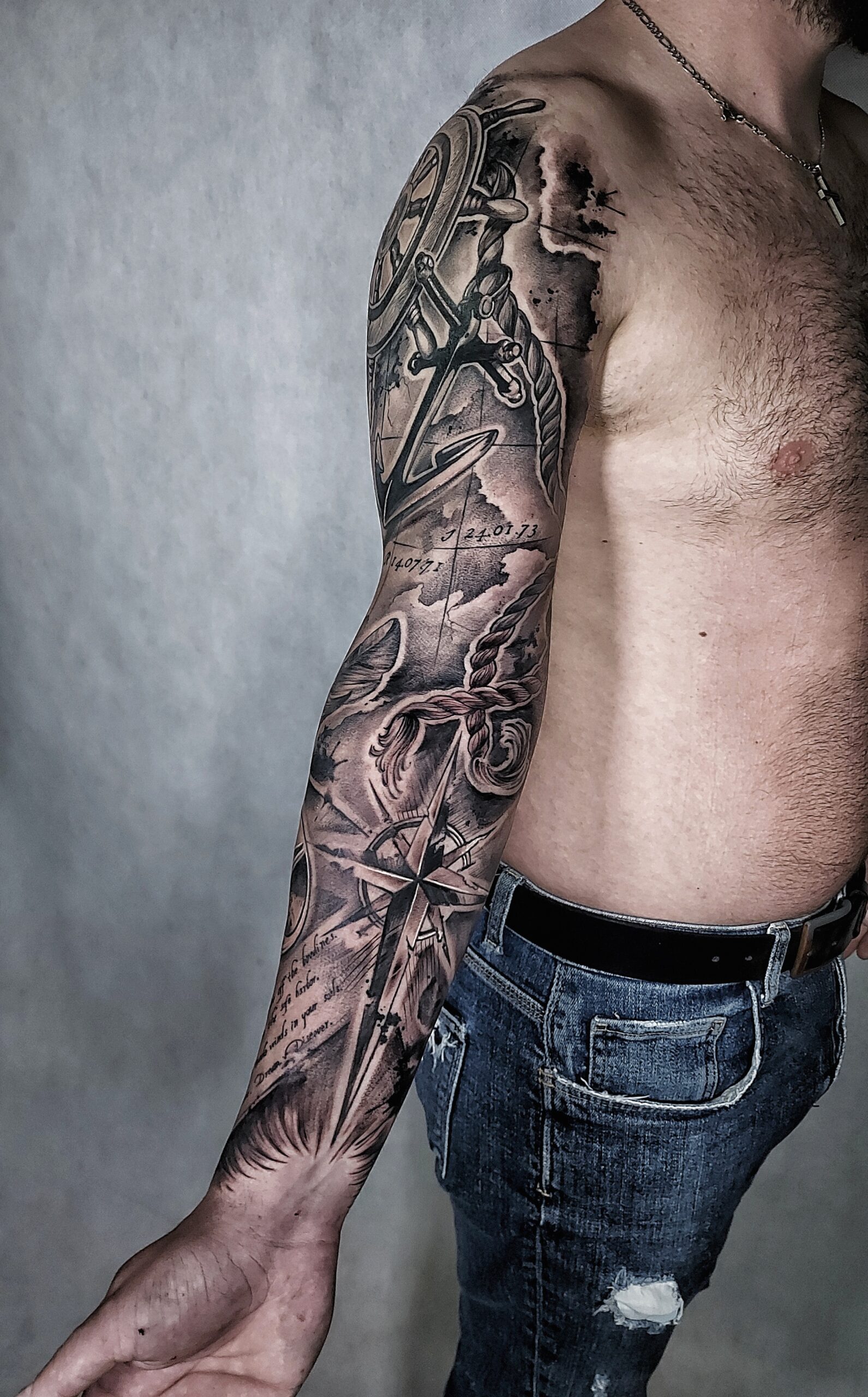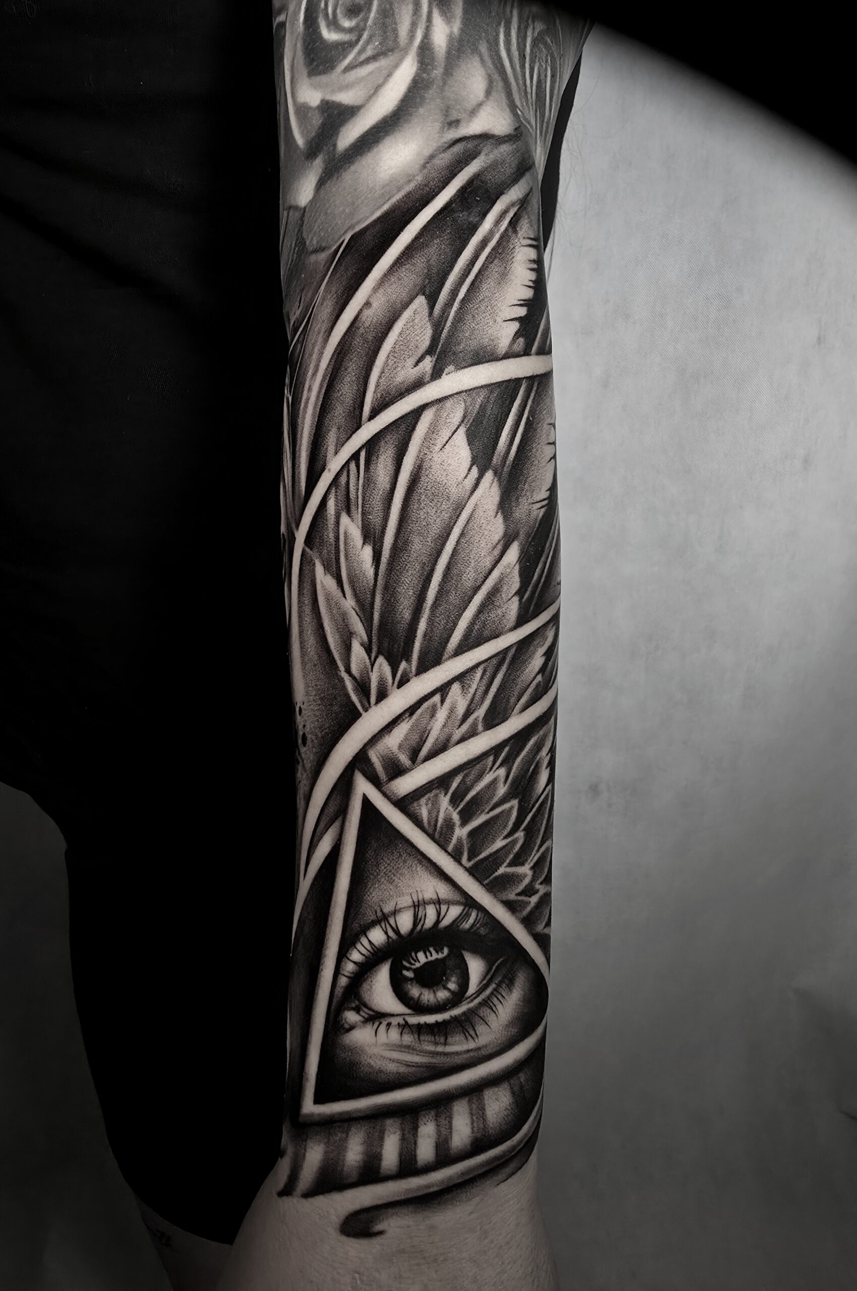 Galeria Prac Rękaw z motywem róż, cierni i zegara. Tył ręki Przód rękawa z różami. Rękaw w stylu graficznym, czarnobiałym. Cała kompozycja zawiera w sobie motywy żeglarskie Feniks na klatce piersiowej. Stitch postać z bajki. Sexy usta w okolicy miejsca intymnego. Plecy w stylu geometrycznym, mandala. Czarnobiały motyw skrzydła i oka w trójkoącie. Magiczny kompas, stanowi część dużej kompozycji na łydce. Magiczna łydka, z tej strony zawarliśmy pasję do gór. Tył łydki z płaszczkami i morzem. Geometryczny tribal na klatce piersiowej, wykonany w stylu dotwork. Kryształek z zębami w stylu neotradycyjnym. My Little Pony na tęczy. Laleczka z okładki zespołu KORN. Kolorowy rękaw neotradycyjny, stworzony z różnych motywów ważnych dla klienta. Kolorowa kobra w stylu neotradycyjnym. Realistyczny skorpion wśród kleksów farby. Neotradycyjny Piesio na podstawie zdjęcia pupila. Płatki śniegu dla miłośnika sportów zimowych. Geometryczna kompozycja łącząca symbole religijne. Potworna rybka z głębin w kolorowym i bardziej wesołym wydaniu. Część czarnobiałego rękawa, mały złodziejaszek dolarów. Połączenie mandali z piwoniami na plecach, które są również coverem. Ramię w tęczowych kolorach z Pokemonami. Magiczna żabka na czaszce. Geometryczna rozeta na klatce piersiowej w stylu dotwork. Opaski wokół całego przedramienia z motywami nordyckimi. Ja podczas Gastro party.